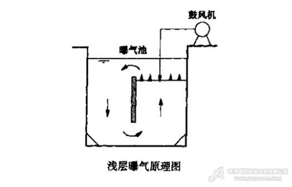 淺層低壓曝氣又名因卡曝氣(INKA aeration),是瑞典ka公司所開發的,其原理基于氣泡在剛剛形成的瞬息間,其吸氧率最高。如圖所示。曝氣設備裝在距液面800~900mm處,可采用低壓風機。單位輸入能量的相對吸氧量可達最大,它可充分發揮曝氣設備的能力。風機的風壓約1000mm左右即可滿足要求。池中間設置縱向隔板,以利液流循環,充氧能力可達1.80~2.60kg/(kW.h)。工藝缺點是曝氣柵管孔眼易堵塞。