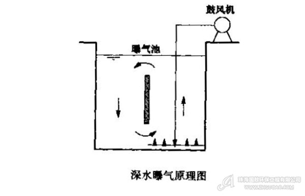 曝氣池內水深可達8.5~30m,由于水壓較大,故氧利用率較高;但需要的供風壓力較大,因此動力消耗并不節省。近年來發展了若干種類的深水曝氣池,主要有深水底層曝氣、深水中層曝氣,其中包括單側旋流式、雙側旋流式、完全混合式等。為了減小風壓,曝氣器往往裝在池深的一半,形成液―氣流的循環,可節省能耗。當水深超過10~30m時,即為塔式曝氣池。見下圖