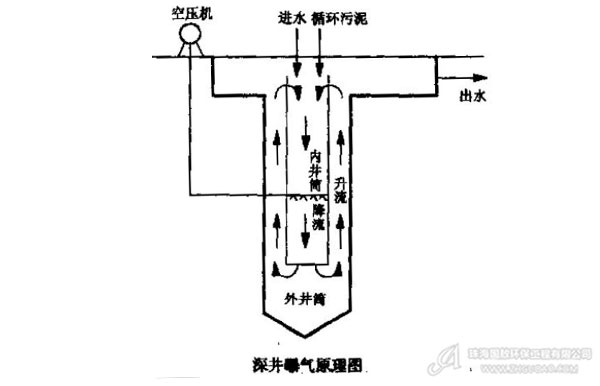 深井曝氣是20世紀70年代中期開發的廢水生物處理新工藝。深井曝氣處理廢水的特點是:處理效果良好,并具有充氧能力高、動力效率高、占地少、設備簡單、易于操作和維修、運行費用低、耐沖擊負荷能力強、產泥量低、處理不受氣候影響等優點。此外,在大多數情況下可取消一次沉淀池,對高濃度工業廢水容易提供大量的氧,也可用于污泥的好氧消化。深井曝氣裝置,一般平面呈圓形,直徑大約為1~6m,深度50~150m。在井身內,通過空壓機的作用形成降流和升流的流動。見下圖