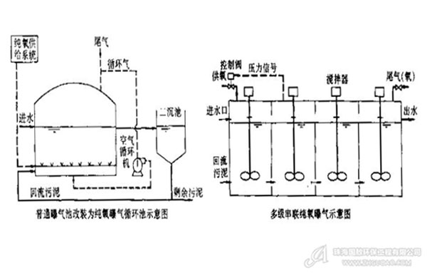 (1)空氣中含氧一般為21%,一般純氧中含氧為90%~95%,而氧的分壓純氧比空氣高4.4~4.7倍,因此純氧曝氣能大大提高氧在混合液中的擴散能力;