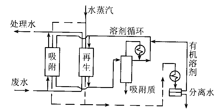 (2)有機(jī)溶劑再生。用苯、丙酮及甲醇等有機(jī)溶利,萃取吸附在活性炭上的吸附質(zhì)。再生工藝流程見圖2。例如吸附高濃度酚的炭也可用有機(jī)溶劑再生。焦化廠煤氣洗滌廢水用活性炭處理后的飽和炭也可用有機(jī)溶劑再生。