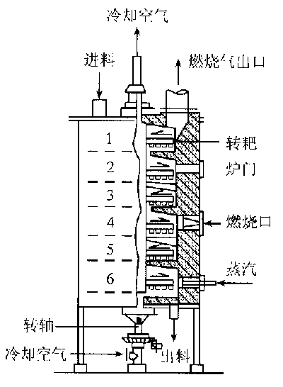 又稱立式多段再生爐,或稱多層耙式爐。主要用于再生粒狀炭,在美國采用較普遍,國內(nèi)也有引進(jìn)。適用于大型活性炭再生,一般再生量都大于2t/d。其特點(diǎn)為:用天然氣或油作燃料,水蒸汽活化,由爐頂部供飽和炭,用轉(zhuǎn)動的粑臂將炭推送至下一層,由上至下6層(或8層),見圖4。