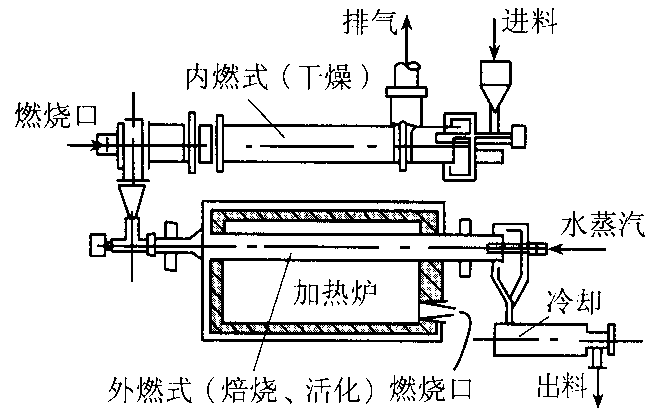 又稱轉(zhuǎn)爐,有一段式或二段式,有內(nèi)燃式直接加熱或外燃式間接加熱。內(nèi)燃式炭再生損耗較大,外燃式效率較低,活化段須微正壓且通水蒸汽活化。圖5為二段回轉(zhuǎn)式再生裝置,干燥段用內(nèi)燃式轉(zhuǎn)爐,焙燒、活化段用外燃式轉(zhuǎn)爐。